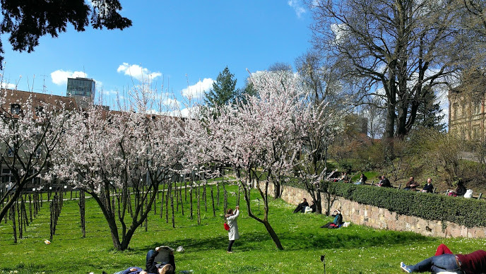 Today I have been wondering around freiburg enjoying the first sunny day of a spring that almost forgot to come to Europe in 2013. Seriously! This has been the longest European winter since the year I arrived to Europe. I know winter can be long in these latitudes, but if you could see the happiness in the faces of most of the people outside enjoying the sun and grabbing cofee in the terraces you would understand what I'm talking about. Anyway, when I was waking from the train station I saw this woman taking a picture to the first blossoms and you can see her and see them in this picture. Welcome spring!!!