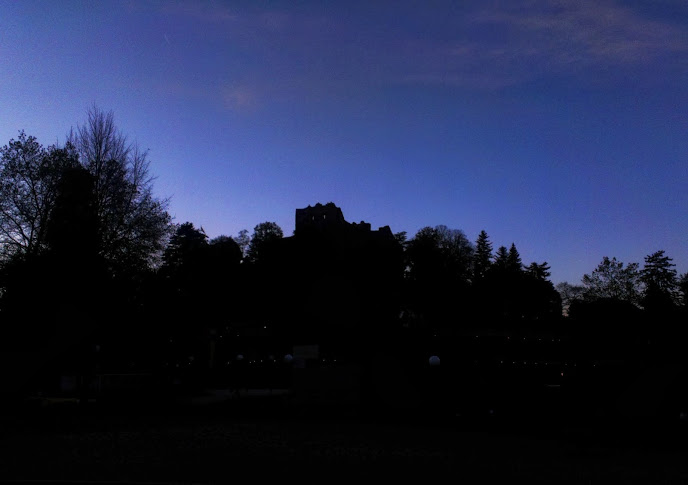 Yesterday we enjoyed a nice day at the thermal baths of this German city located very close to Basel, Mulhouse and Freiburg. This was the first time we visited this town and it turned out to be a pintoresque place with a couple of fancy hotels, some restaurants and full of baths due to the spring mineral waters it possesses. When we were arriving to the town we noticed from the distance the ruins of a castle and when we were going back to the car we noticed it again, so I grabbed my phone and took a picture. I was able to get a nice silhouette of the castle at this time of the year.