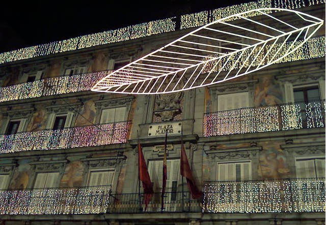 The second time I visited Madrid was in the Winter of 07. It was nice that the weather wasn't particularly cold. One night I was walking in the plaza mayor and I got took a picture showing the Christmas Lights.